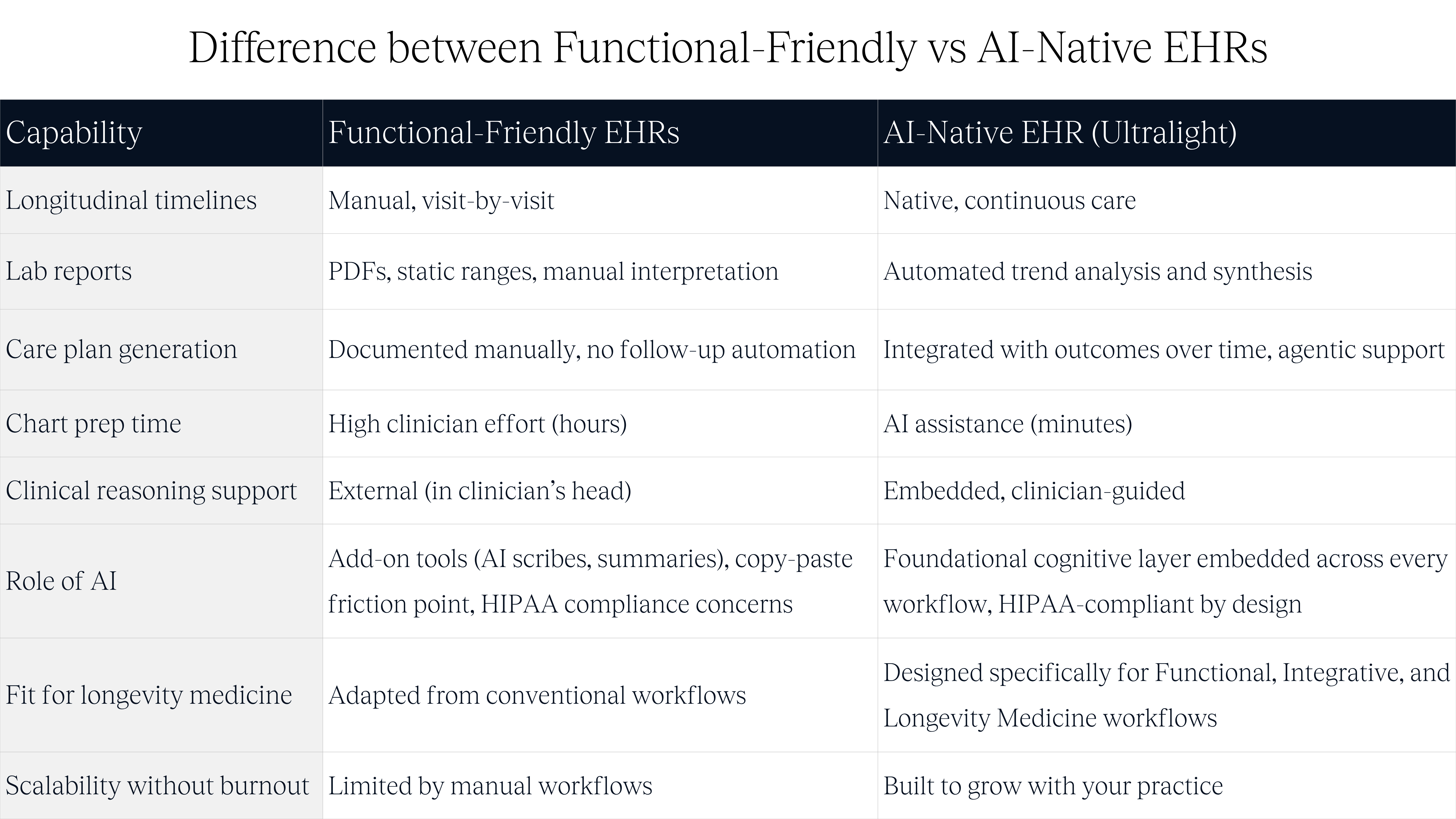 - Ultralight Health. An AI-native EHR built specifically for functional, integrative, and longevity medicine. Rather than focusing on static documentation alone, Ultralight Health (previously known as Vibrant Practice) is designed to synthesize labs, timelines, notes, and protocols into clinically meaningful insights and a living repository of medical assets practitioners can interact with, reducing prep time while preserving clinical depth and for many users… restoring joy back into clinical practice.